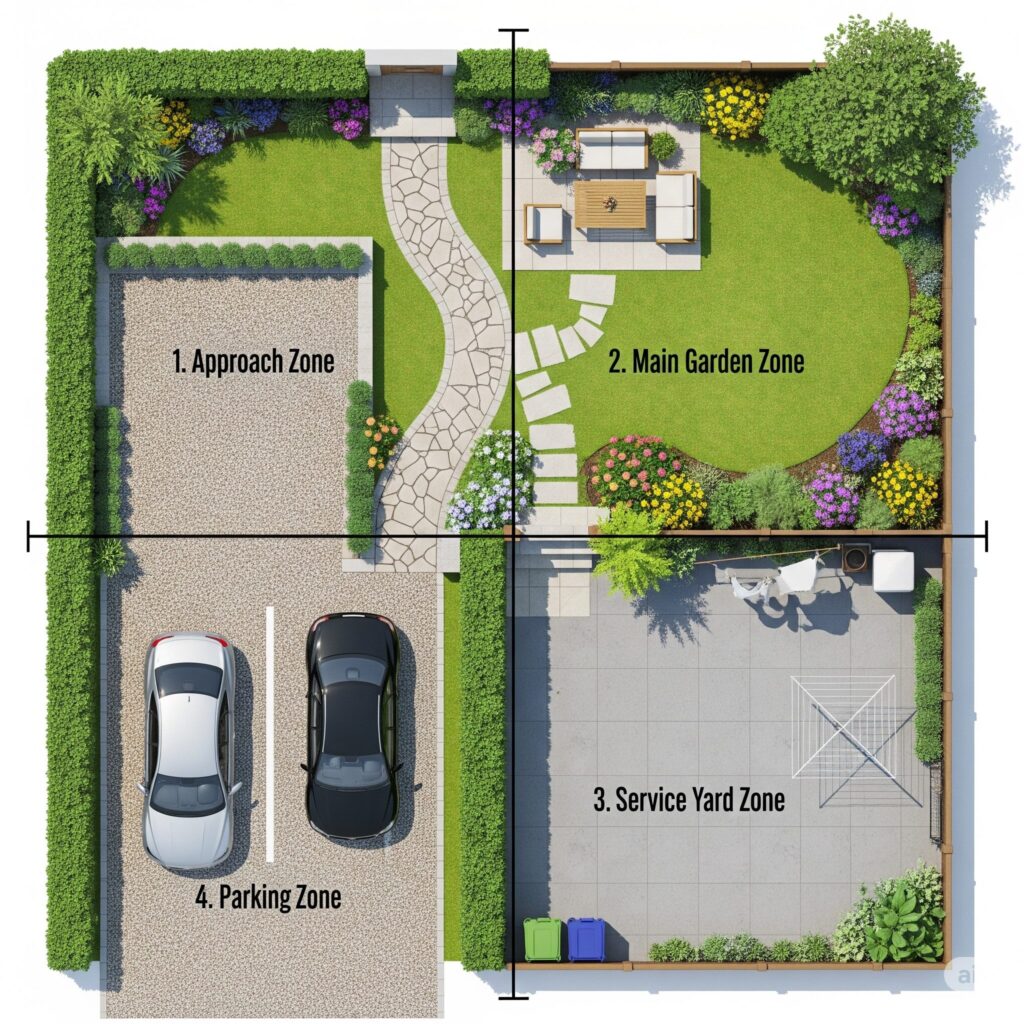 これらのゾーンを、敷地の形状、建物の配置、そして「庭の目的」に基づいて大まかに配置していきます。