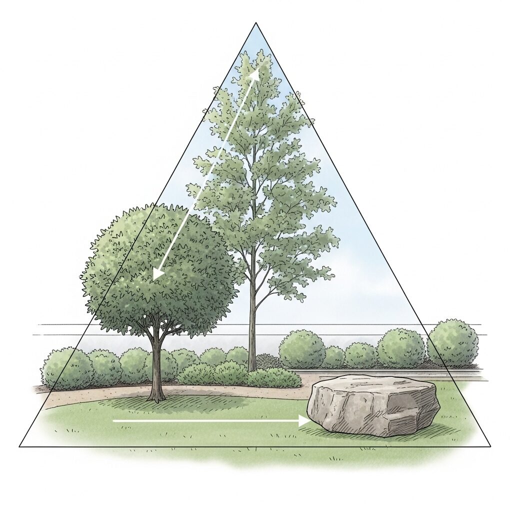 正三角形や二等辺三角形のように整然と並べるのではなく、あえて崩すことで、視線が自然に誘導され、庭にリズムと立体感が生まれます。この構図を用いると、全ての木が同じ距離に見えることがなくなり、前後の位置関係が生まれるため、限られたスペースでも奥行きを感じさせることができます。
