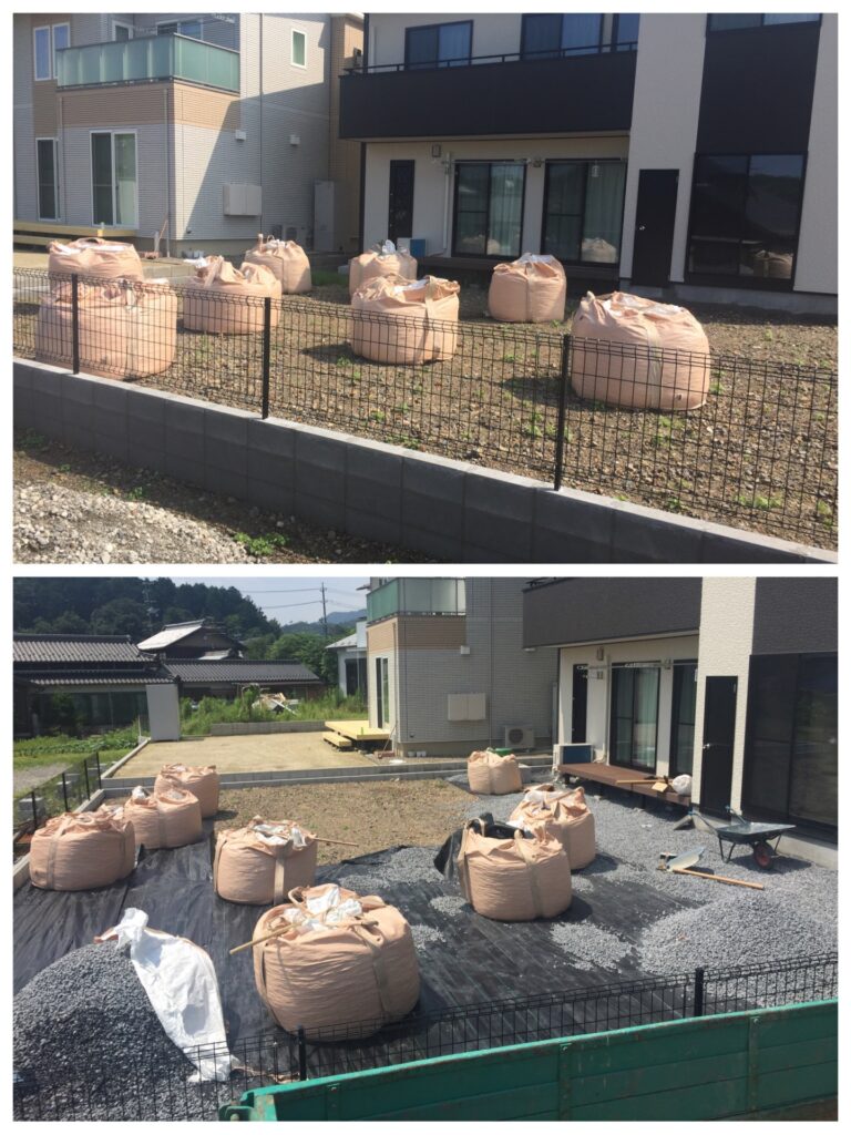 広い敷地で、全面に防草シートを敷いて砂利を敷き詰めるため、10m3という量が。(・・;)