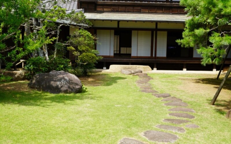 飛石を使った趣のある和風の庭。石組みと緑が織りなす景色は、情緒あふれる空間を演出します。