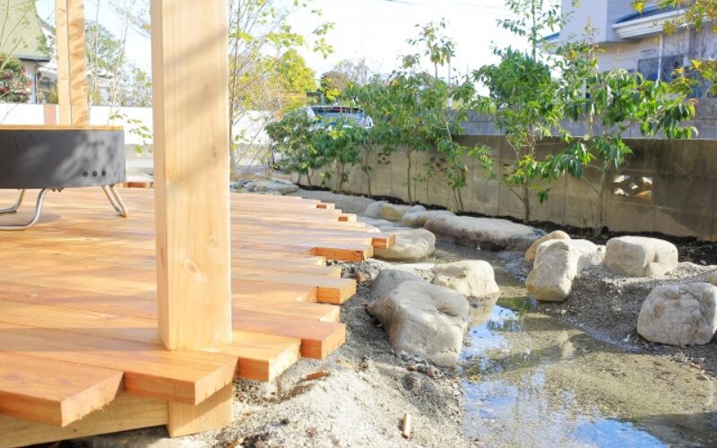 - ウッドデッキやタイルテラスの周りに砂利を敷き、異なる素材感の対比を作る